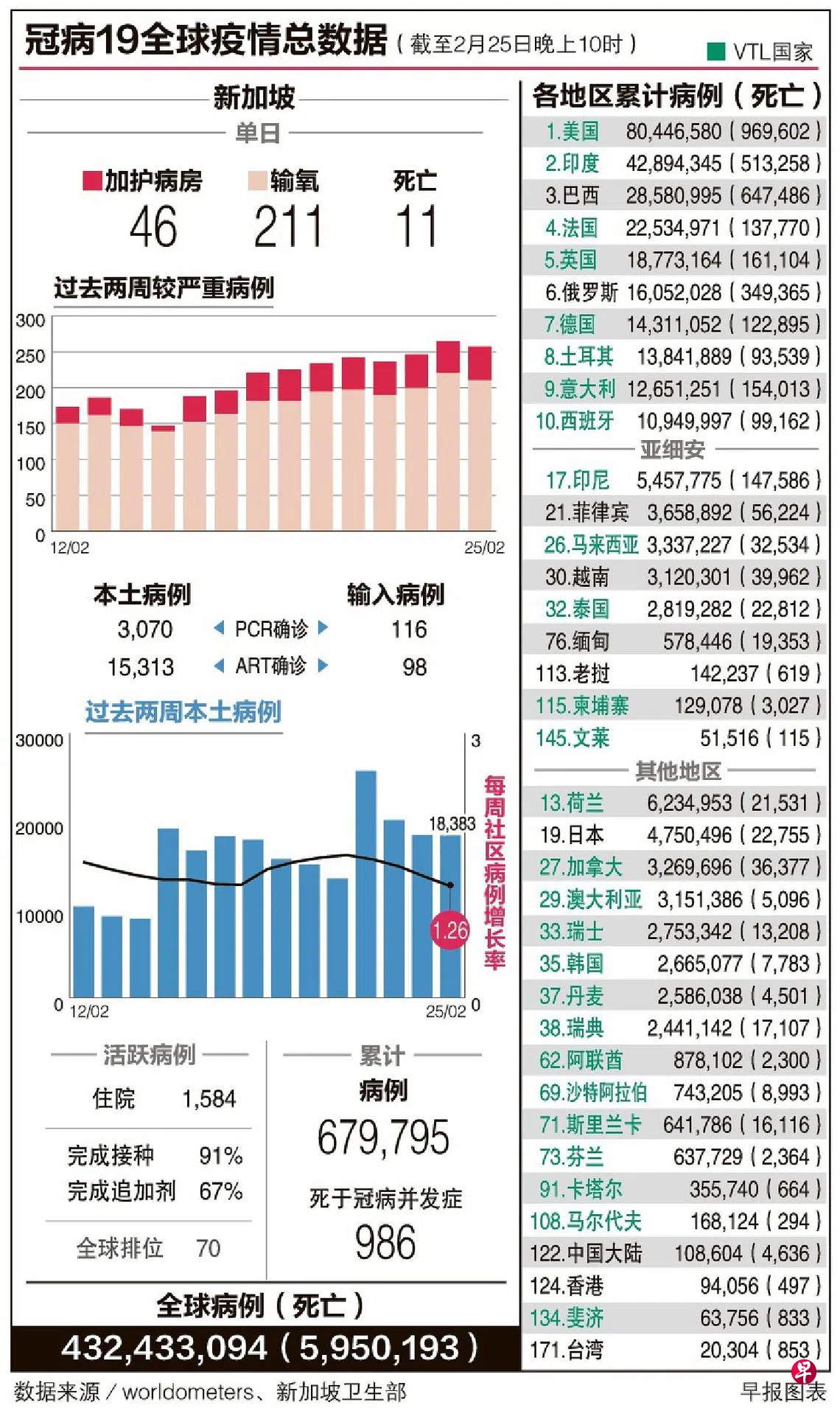 随着更多人完成疫苗接种和注射追加剂,过去28天确诊的33万5780起病例中,99.7%无症状或只有轻微症状,0.2%需要输氧,0.04%在加护病房,0.04%病逝。