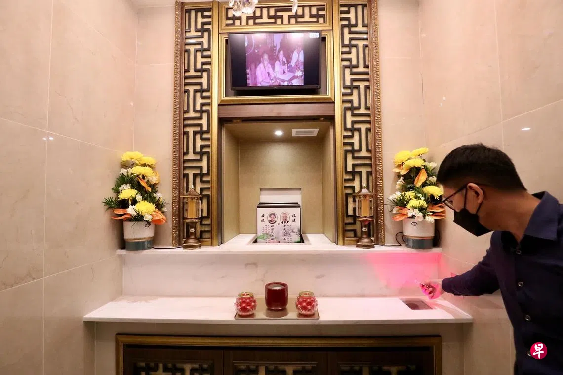 坐落于淡滨尼路一带的金山永恒生命纪念馆耗资2500万元建造,采用自动化储存和检索系统,将约1万7000个骨灰瓮储存在地下层。家属在柜台扫描专属证件卡后,系统就会安排私人祭拜厢房给他们,并将亲人的骨灰瓮自动运送往厢房内。此安置所将在来临清明节24小时开放。