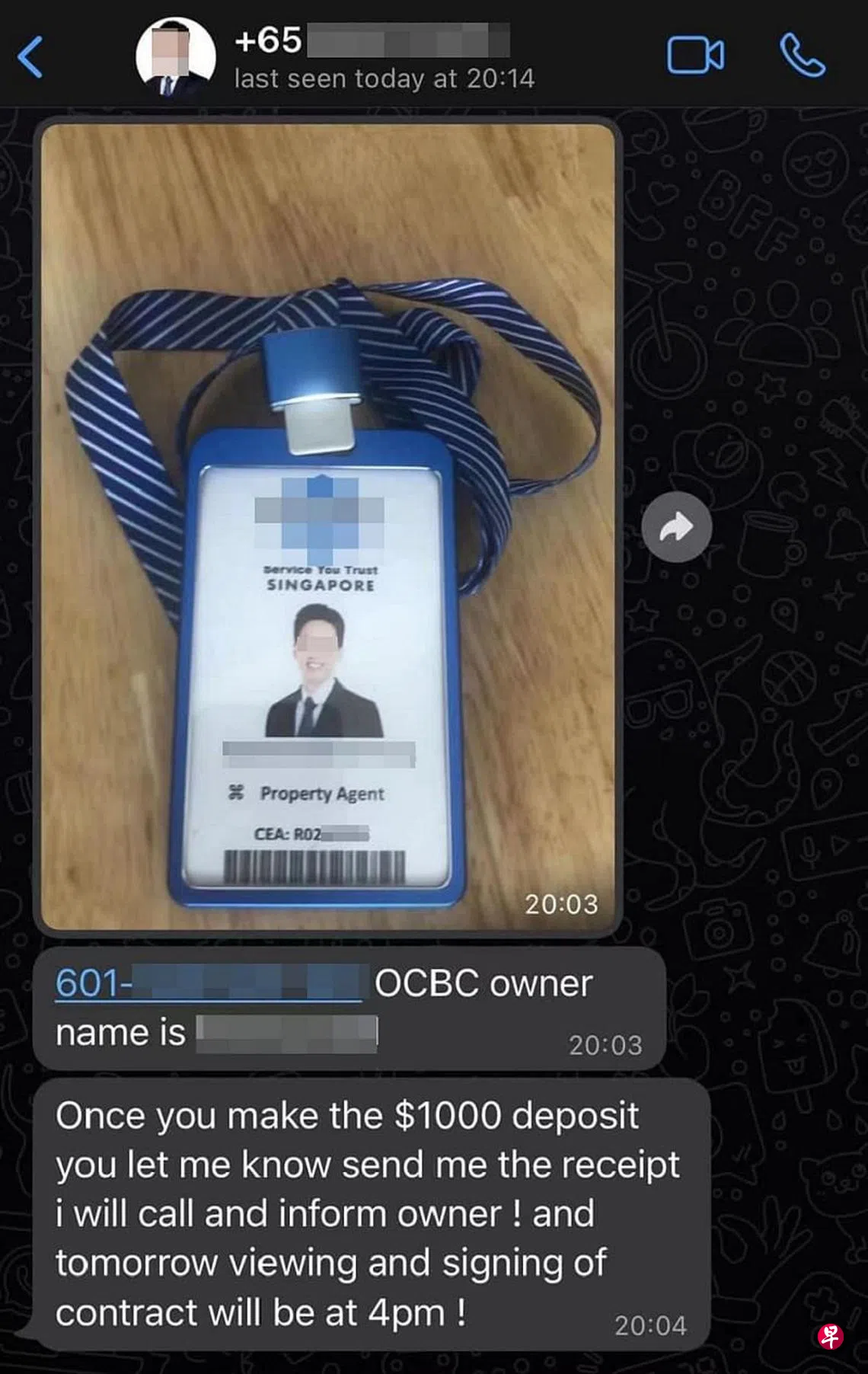 诈骗新招!不法之徒盗用房地产公司之名、中介名字以及照片,再狮子开大口,要求预付1000元订金才能看房,房地产公司怒斥,并将报警处理。
