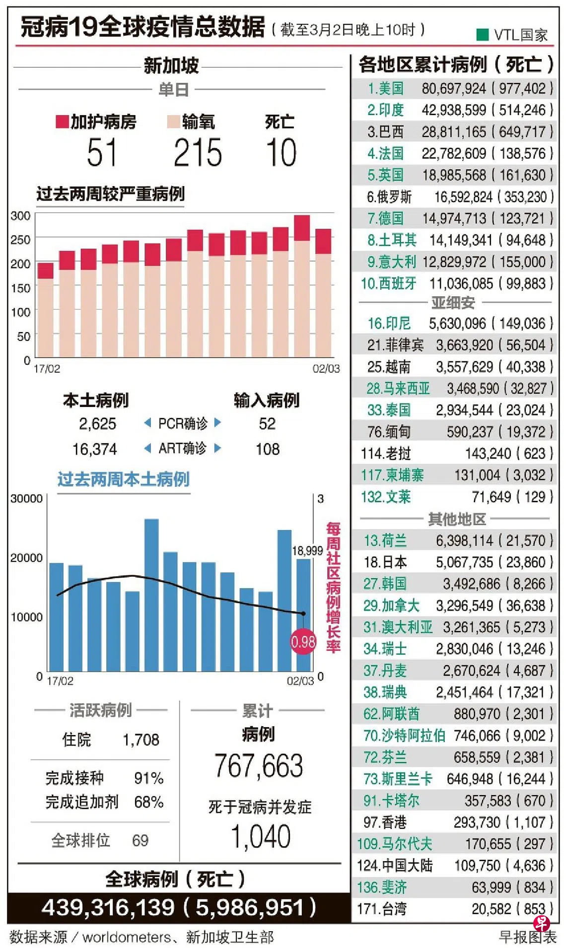 截至前天,全国人口中91%已完成基本疫苗接种程序,68%已注射追加剂。随着更多人完成疫苗接种和注射追加剂,过去28天确诊的40万零433起病例中,99.7%无症状或只有轻微症状,0.2%需要输氧,0.04%在加护病房,0.04%病逝。