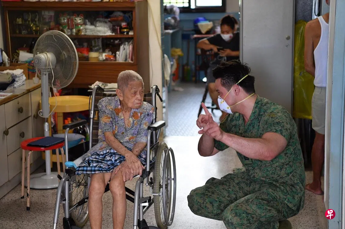 新加坡陆军上尉(战备)陈渊羽(32岁)是美容医生,日间在自己的诊所忙碌,晚上8时至隔天早上9时到伊丽莎白医院和安微尼亚山医院照看冠病患者,每天几乎工作24小时,只在值勤间隙争取休息。在这期间,他也被国防部召回执行登门接种疫苗任务。