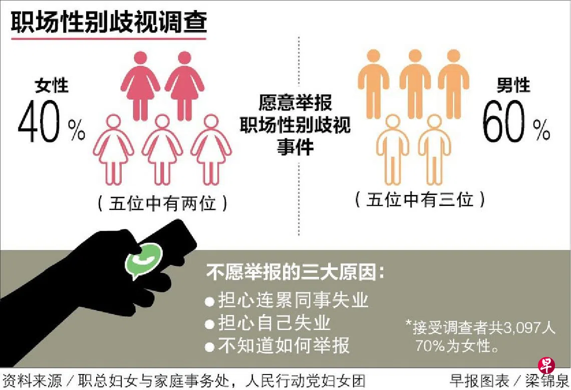 职总妇女与家庭事务处和人民行动党妇女团自1月10日起展开为时一个月的职场性别歧视调查,参与调查的共有3097人,其中女性占七成。