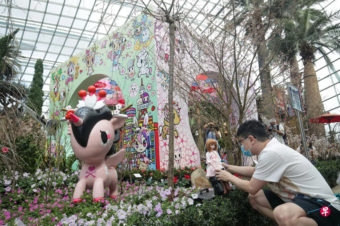 一年一度的樱花花卉展昨天在滨海湾花园花穹开幕。除了265株来自日本和欧洲的樱花树,场中布景还搭配了可爱的潮流品牌淘奇多奇(tokidoki),加上鸟居、日式凉亭、茶亭、鲤鱼旗等装饰,让人有置身日本的错觉。