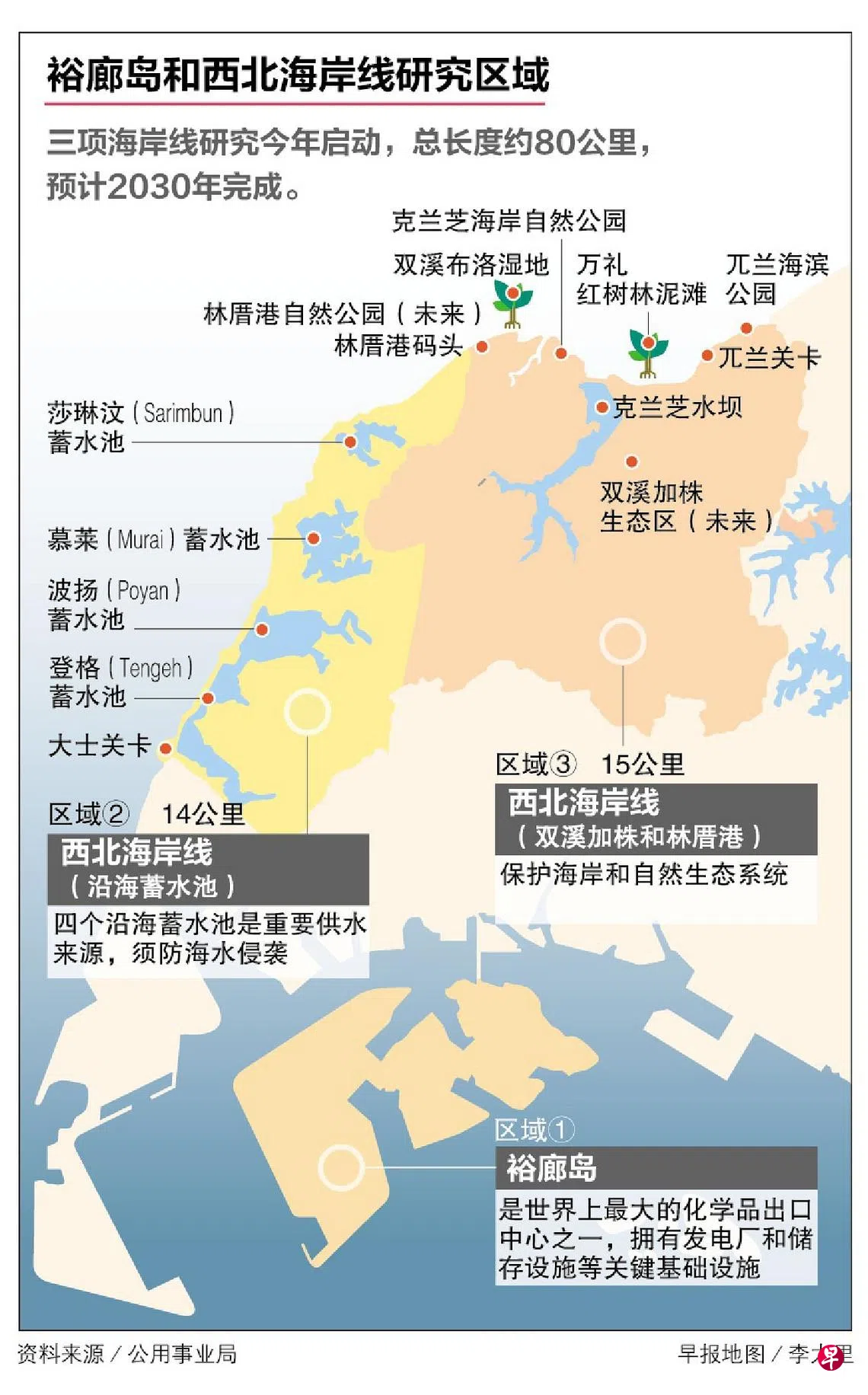 其中,由公用事业局负责的西北海岸线将分成两段进行研究。第一段是大士关卡到林厝港码头的全长24公里海岸线,沿途包含主要使用堤坝筑起的四个沿海蓄水池——慕莱(Murai)、波扬(Poyan)、莎琳汶(Sarimbun)和登格(Tengeh)。它们作为我国重要的供水来源,须防止因海平面上升带来的海水侵袭。