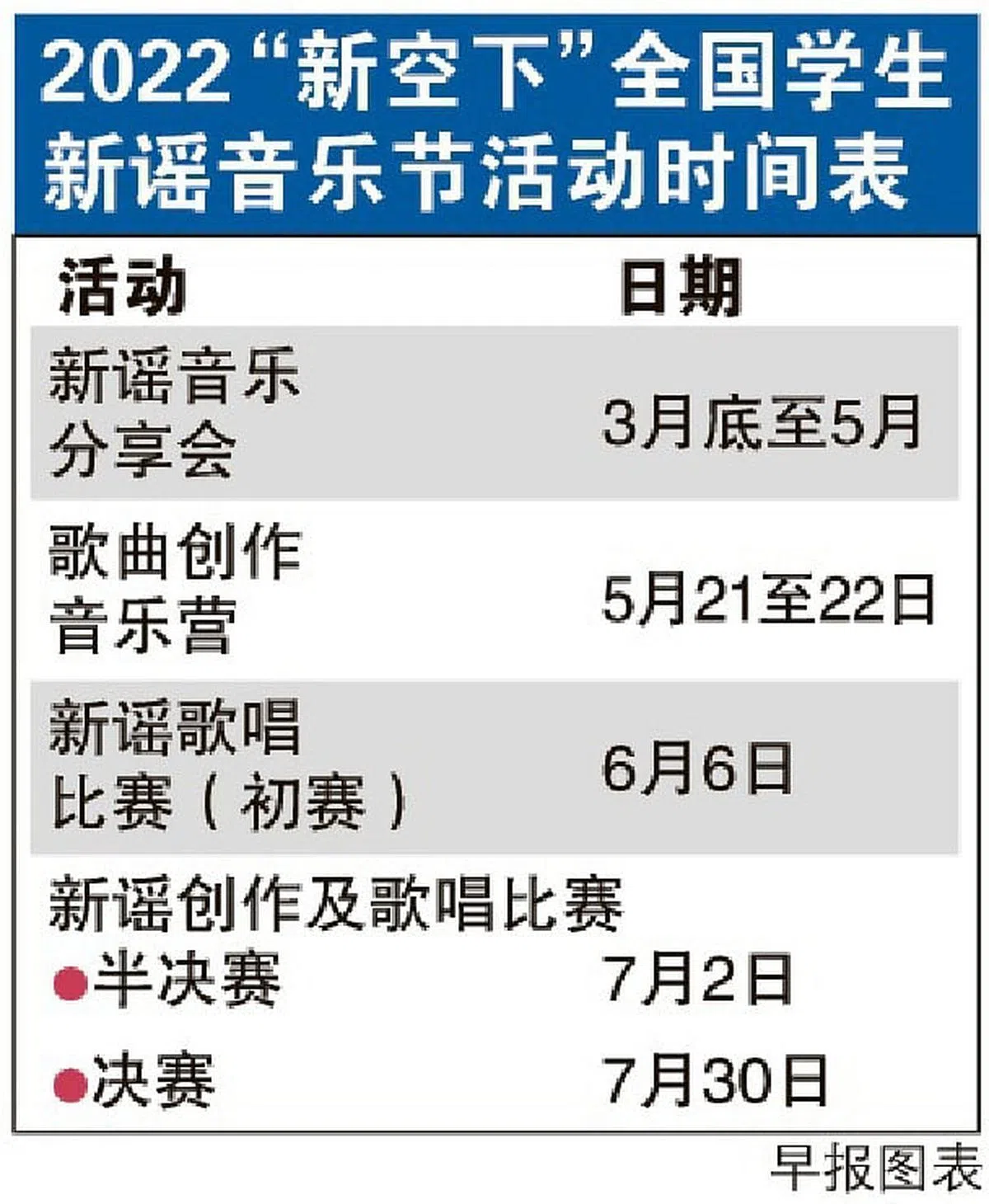 新谣歌唱及创作比赛则定于6月到7月进行,今年的比赛还新增了师生合唱组。
