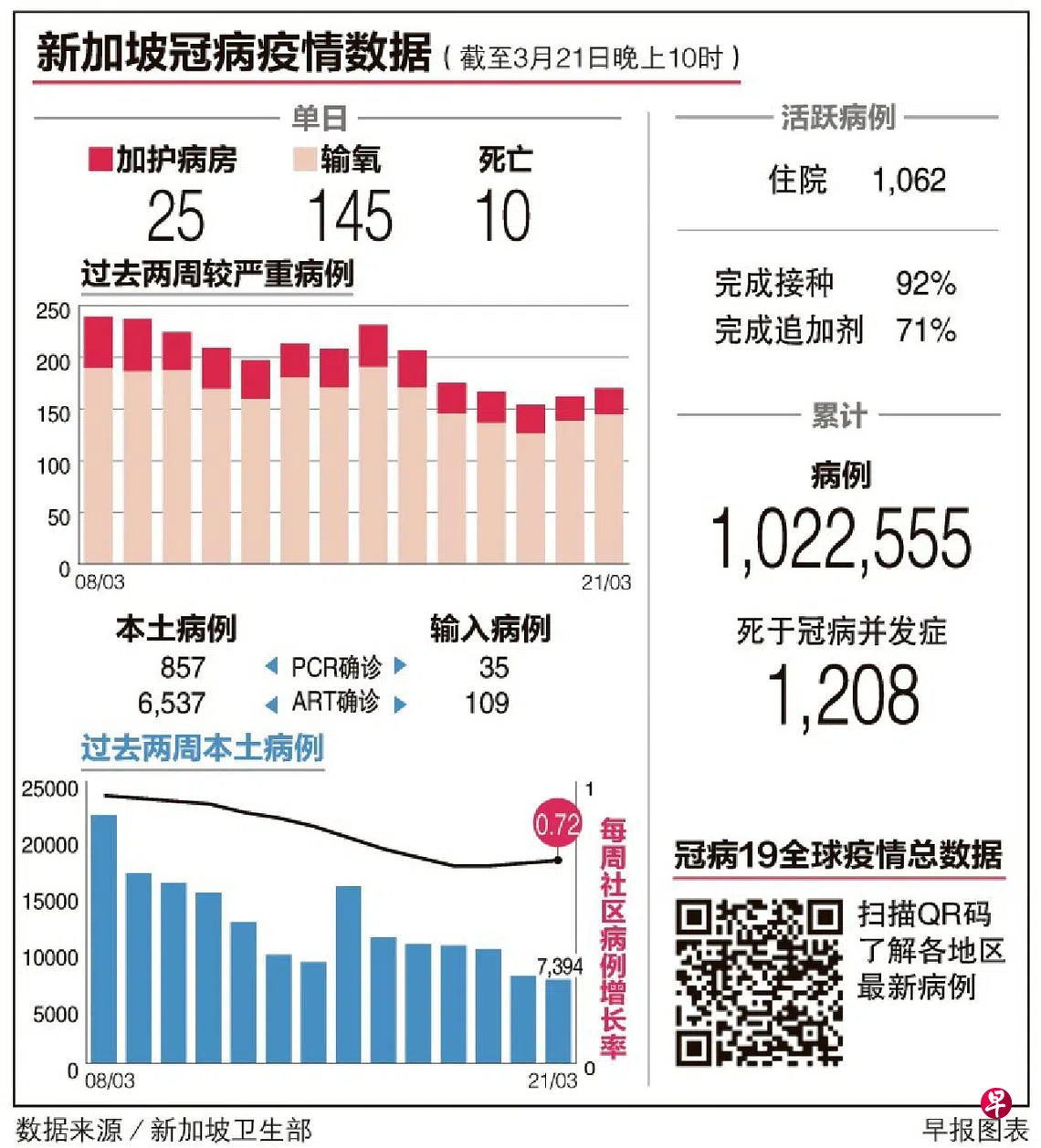 随着更多人完成疫苗接种和注射追加剂,过去28天确诊的42万1815起病例中,99.7%无症状或只出现轻微症状,需要输氧和进入加护病房的分别占0.2%和0.04%,病逝者占0.05%。