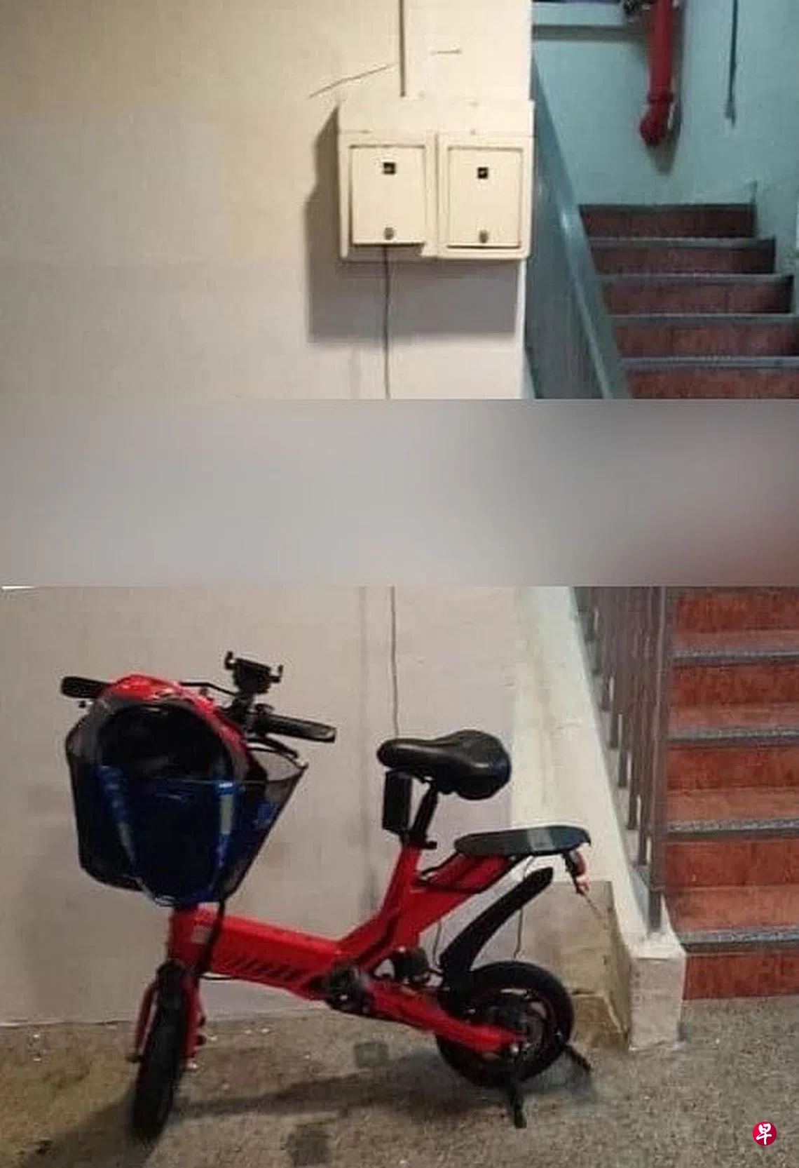根据照片显示,一辆橘红色的电动脚踏车停在楼梯口,有人将电线连接到一个电源插座上。据观察,插座虽然被掩盖着,但盖子没有上锁,打开后就能用。