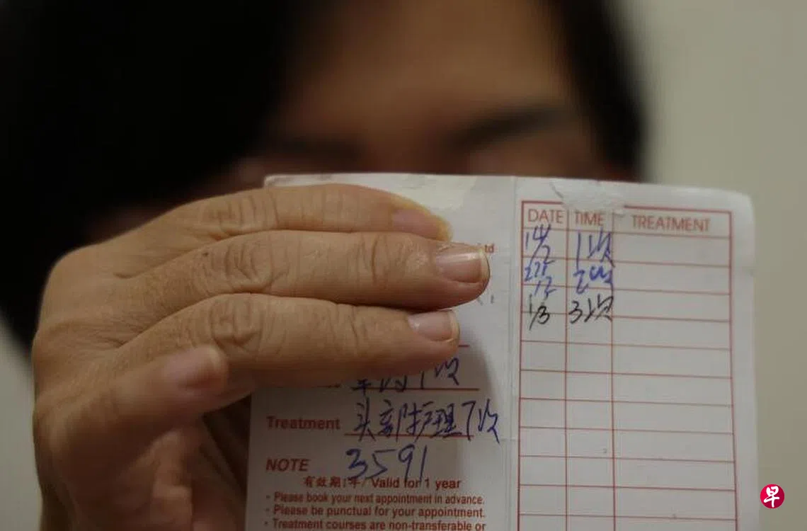 苦主林女士(53岁,兼职保安)告诉记者,去年9月到牛车水时,在地铁站出口处遇见正在发传单的美容护理中心店员,对方推荐她尝试收费10元的20分钟推拿体验。
