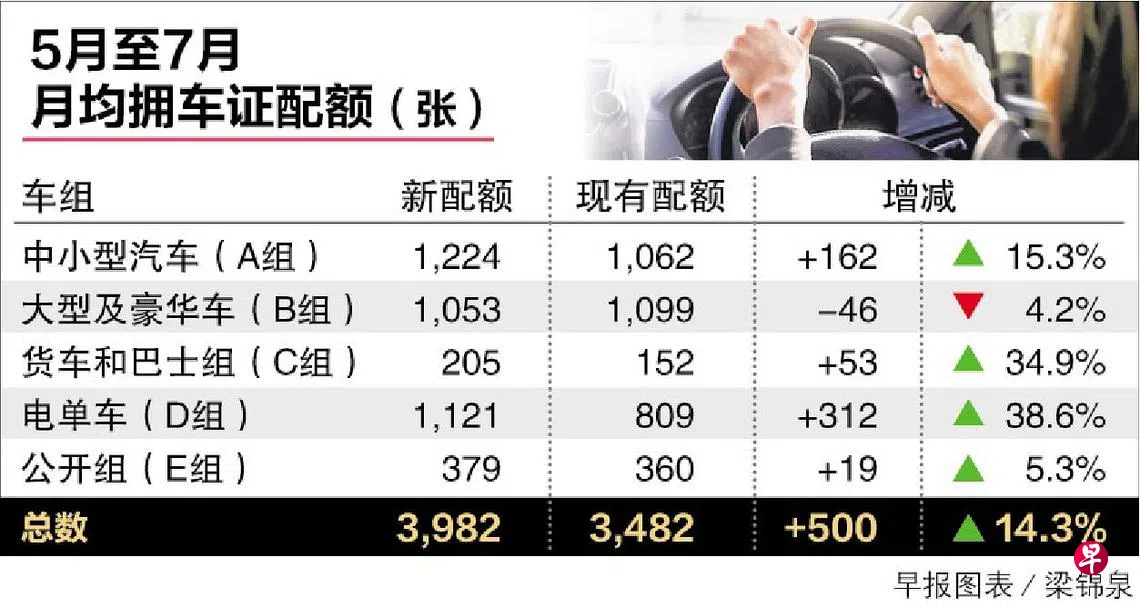 5月至7月的拥车证共计1万1951张,每月平均有3982张。陆交局是根据1月至3月的报销车辆数量、C组的0.25%常年增长率,以及其他因素如德士车队的拥车证等,来计算未来三个月的拥车证配额。