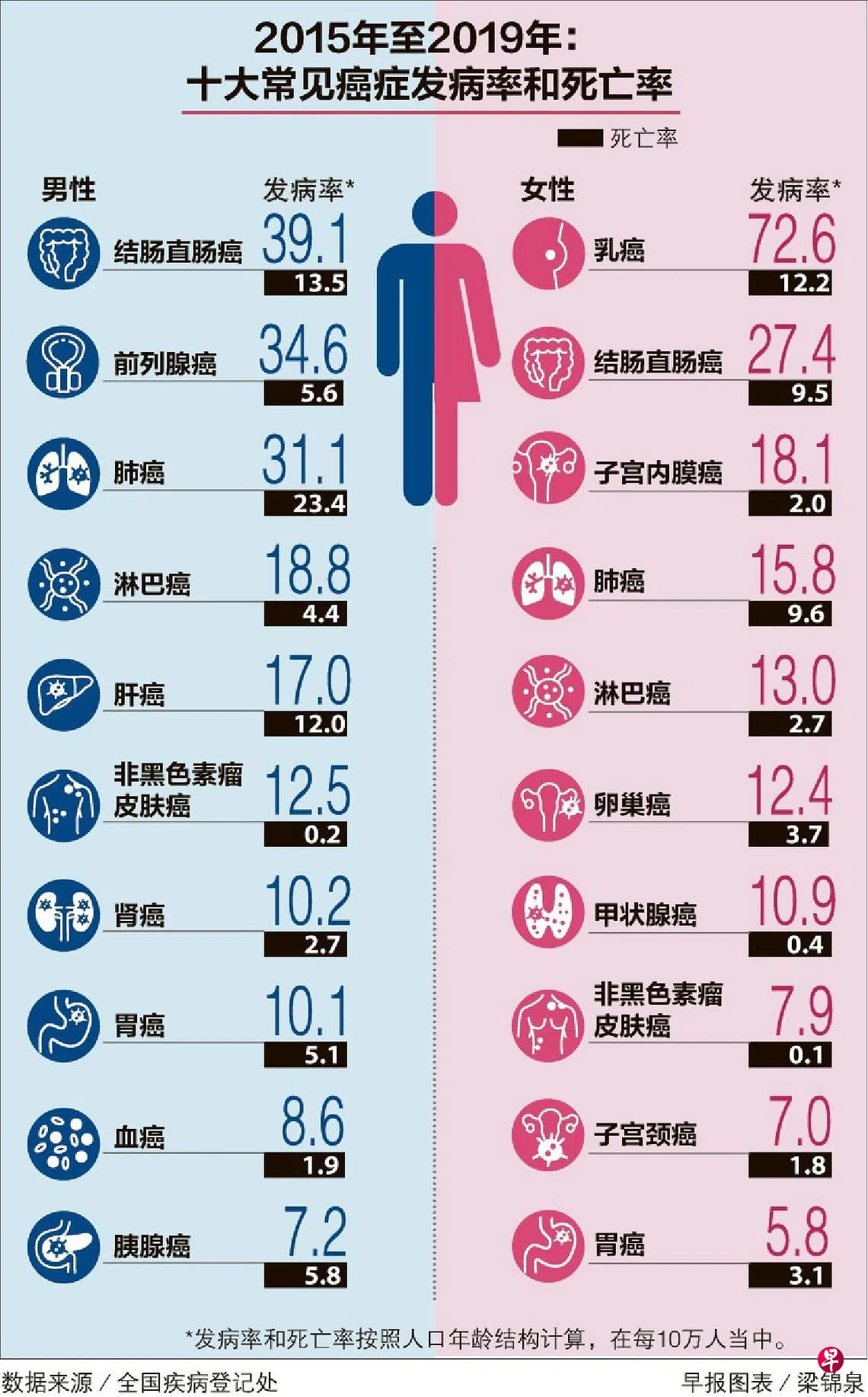 相比之下,男性的年龄标准化发病率只略加10人至238.6人,死亡率则从121.8人下降至93.3人。