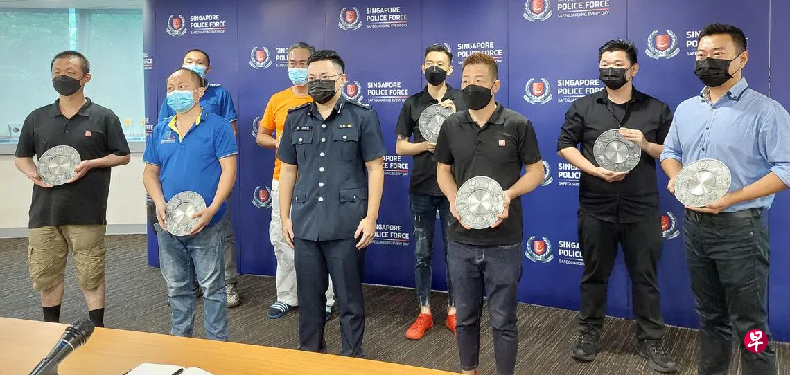 美芝路火锅店外持刀砍人案,公众拿塑料椅、小梯子、铁盘、垃圾桶、广告站牌丢砸凶徒,救回女伤者一命,10名英勇公众今午(4月18日)获警方颁发公众精神奖表扬。