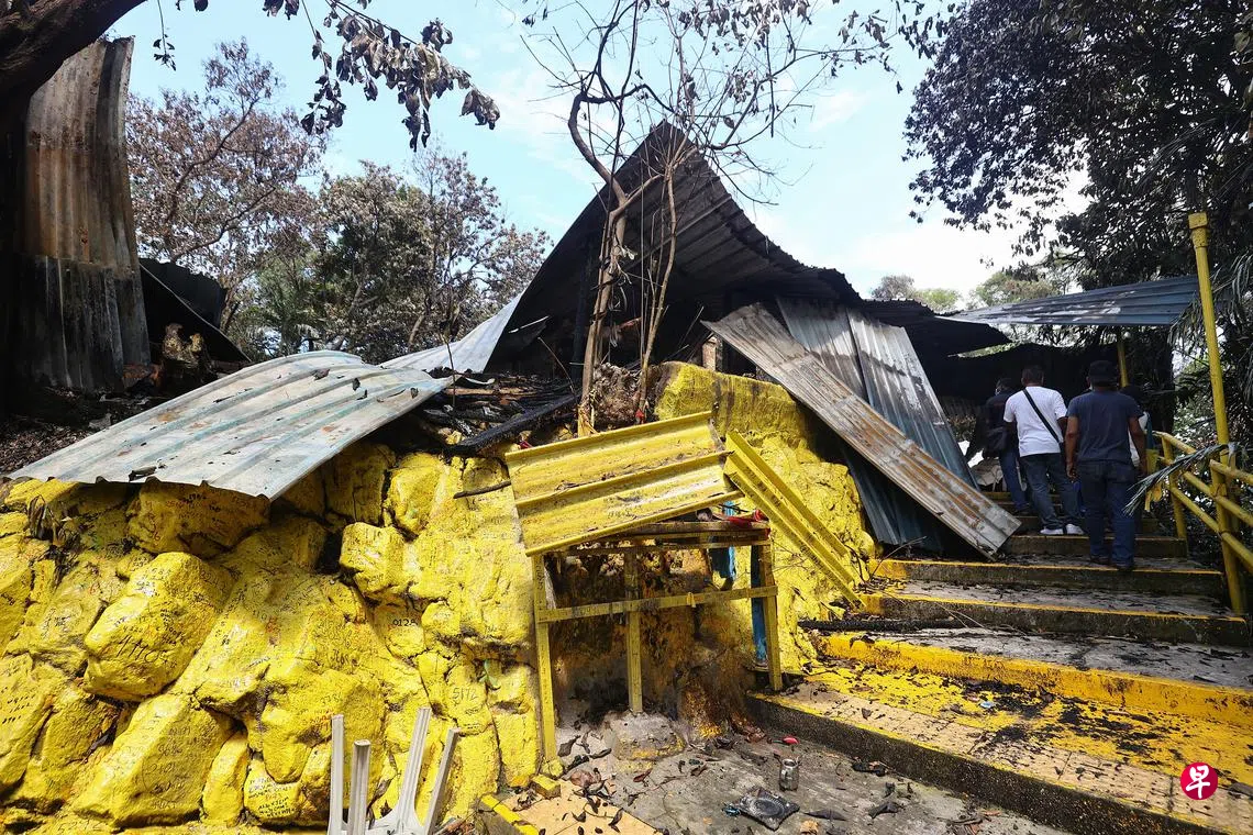 位于龟屿山坡顶处的拿督公庙在星期天晚上经历火劫后,善信所熟悉的黄色梯阶已经面目全非,三个圣祠的木质柱子皆被烧毁,铝铁顶棚也东倒西歪。