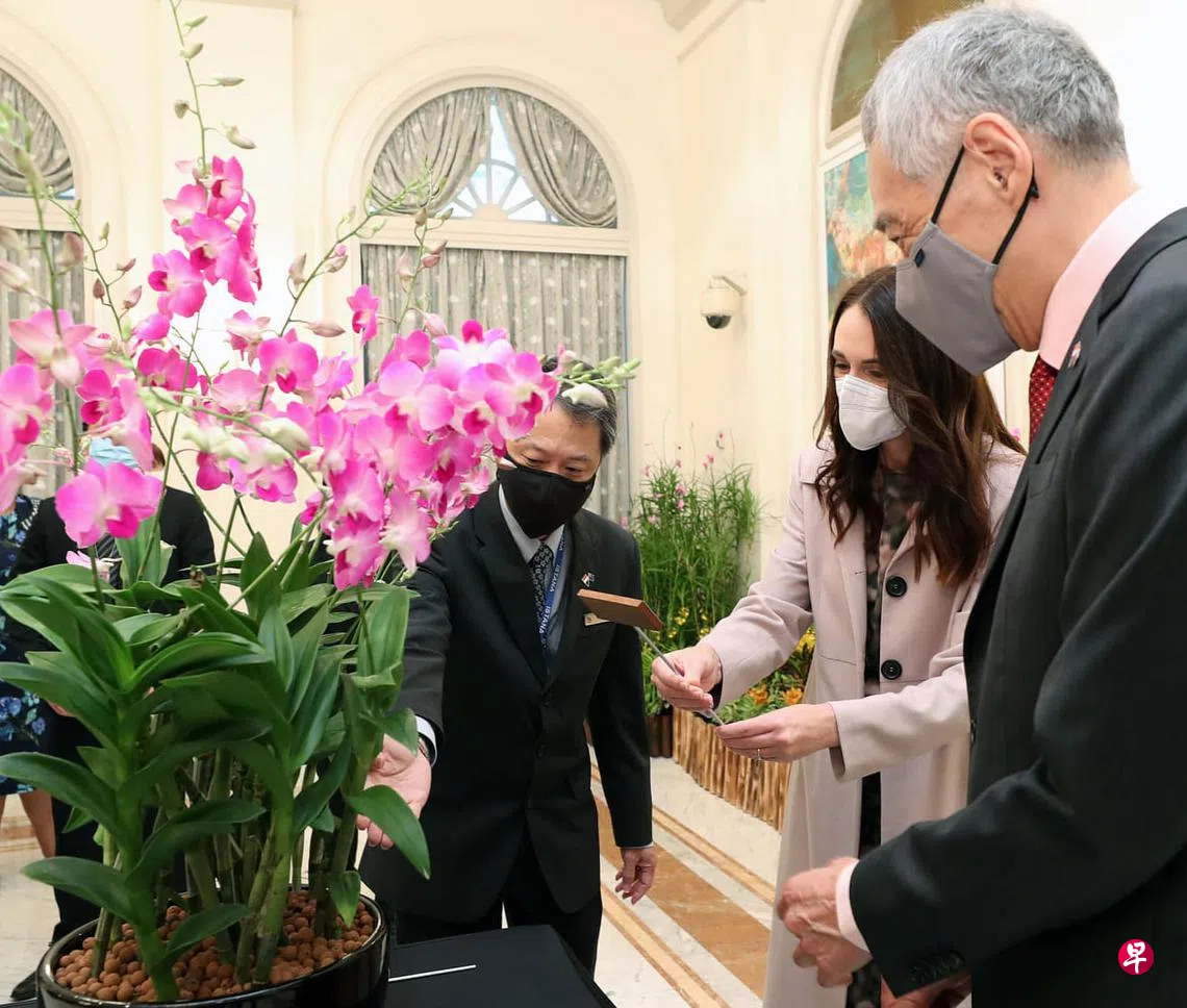 新西兰总理阿德恩昨天(4月19日)在总统府出席胡姬花命名仪式。名为“阿德恩石斛兰”的新品种胡姬花造型美丽,可常年开花,它的花心为白绿色,花瓣和萼片的颜色则会从花心的白色渐变为花瓣边缘的紫色。