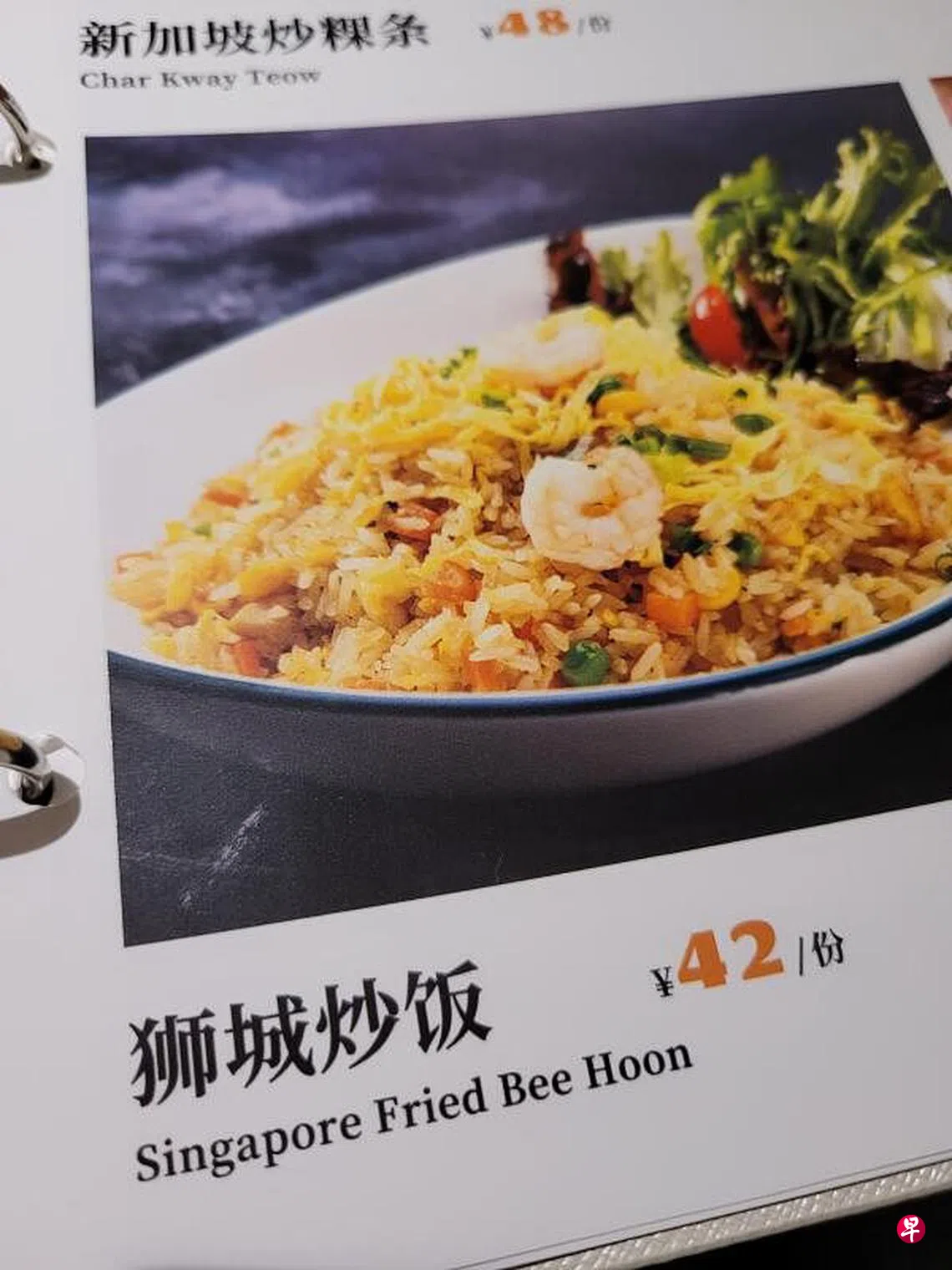 中国北京的新加坡风味餐厅,女侍应生穿着一身卡峇雅服装犹如“新航空姐”,但脚上却穿着球鞋,菜单上的英文翻译也闹笑话。