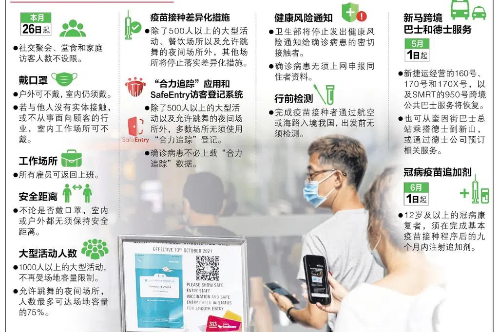 从下周二(4月26日)起,本地大多数场所如宗教场所、购物商场和超市,将取消疫苗接种差异化安全管理措施,公众在进入这些场所时,也不必使用合力追踪(TraceTogether)应用或便携器登记。