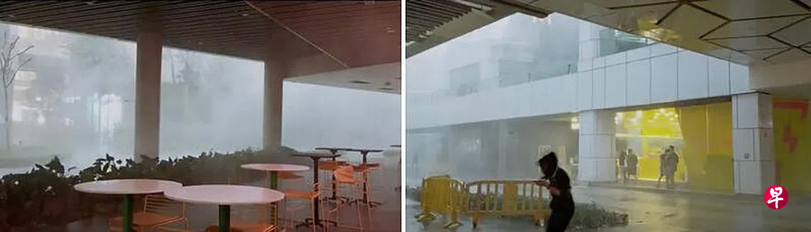 一名TikTok用户在裕廊东的JEM和西城(Westgate)商场外将画面拍了下来,从视频中可见,当时大雨倾盆而下,天空像是降下了一块白幕,风吹至路人头发纷飞,大家纷纷进入室内避雨。