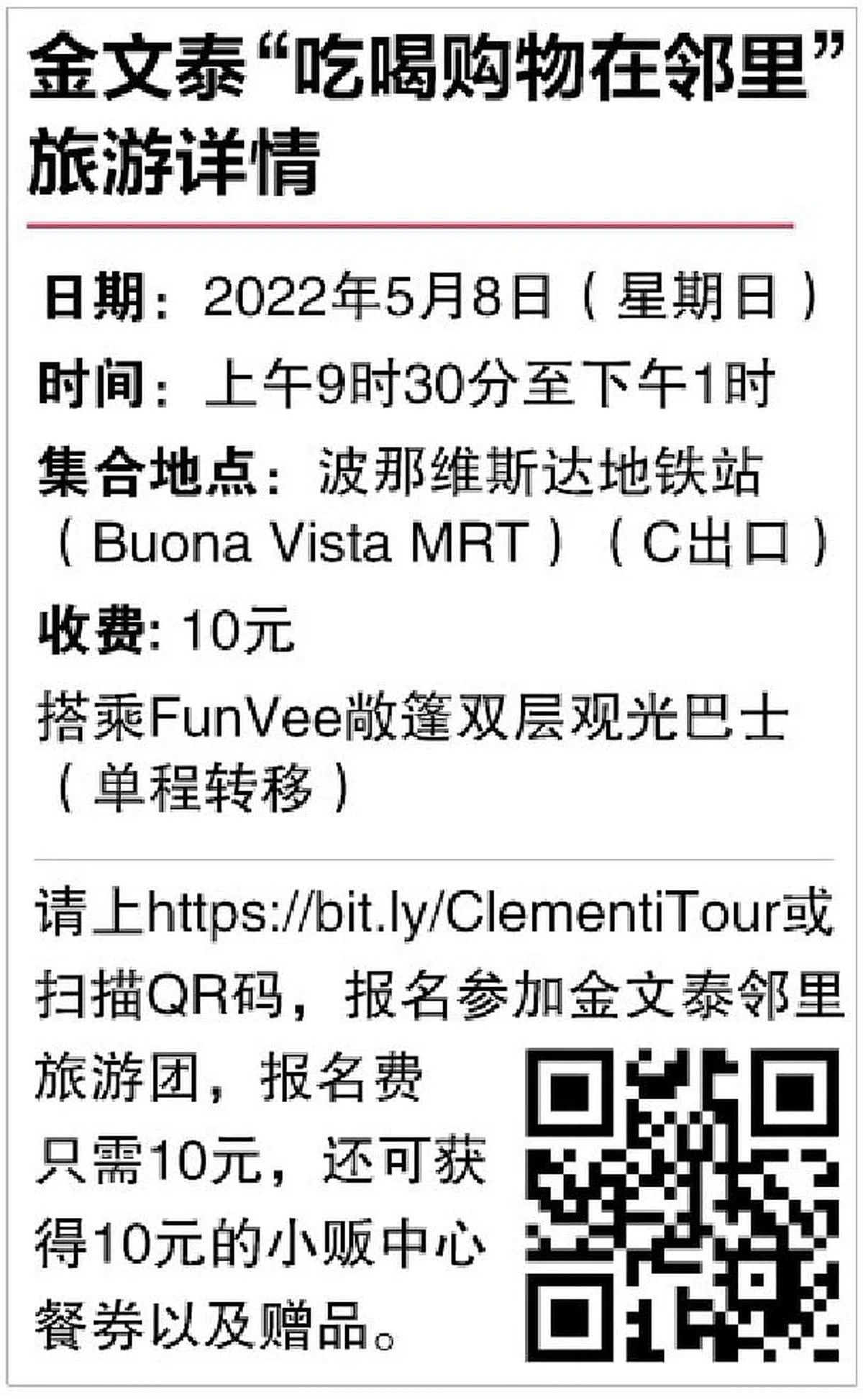 第一系列邻里旅游成功举办,在新加坡企业发展局支持下,新加坡邻里中心与全国商联总会与《联合早报》推出第二系列的邻里旅游,第一站是融合了传统与现代元素的金文泰中心与金文泰小贩中心,将在5月8日(星期天)带领100名公众深入走访那里林立的美食地点与鲜为外人所知的老店。