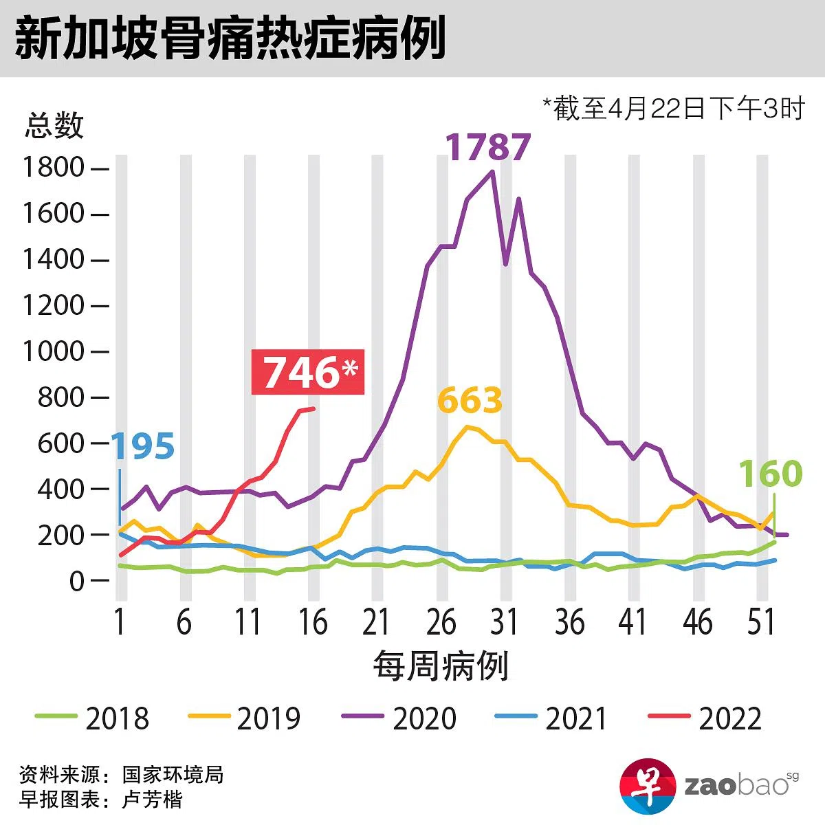 根据国家环境局网站公布的最新数据,骨痛热症每周新增病例从今年2月底起呈现上升趋势,4月10日至16日共计735起新病例,4月17日至22日则有746起,是2020年9月以来新增病例最多的一周。环境局预测,下来几个月的病例会持续增加。