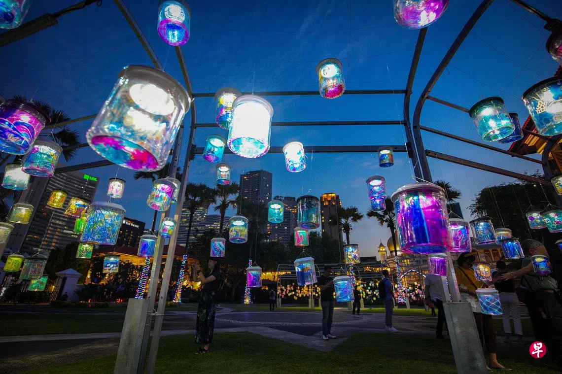 夜幕低垂,悬挂在马来文化馆外的艺术装置亮起五彩缤纷的灯光。