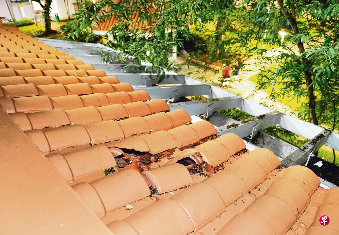 据观察,现场已被清理,二楼走廊的砖瓦被砸破了一个洞,一楼店屋外的拱形出入口处也有一袋泥土,附近的树枝上也挂着花盆碎片。