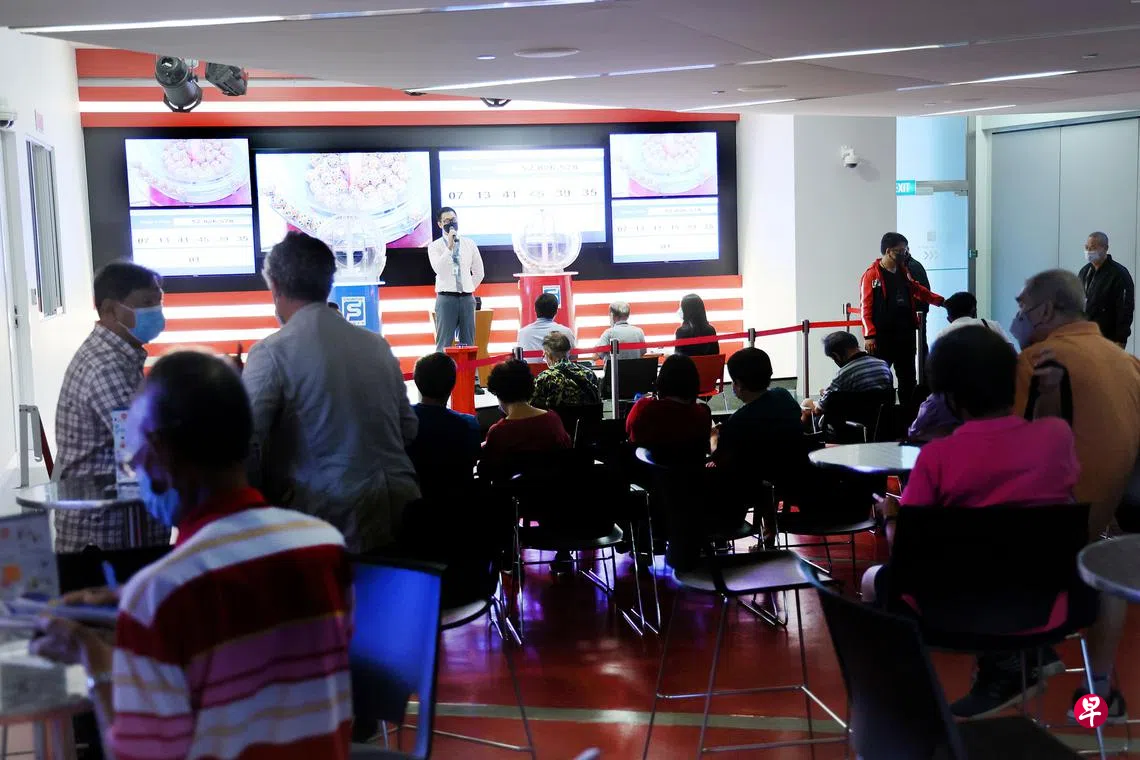 新加坡博彩公司时隔两年重开大门,昨晚迎来20多名“多多迷”现场见证摇珠开彩。自前年4月初我国实行冠病阻断措施后,博彩公司就暂停让公众到现场观看万字票、多多和新加坡大彩的开彩过程。昨天开彩的第3762/2022期多多,是两年多来摇珠现场首次有公众出现。新加坡博彩大厦大门打开前,“多多迷”早已等候多时,他们过后在工作人员的带领下走进摇珠现场,过程虽无须出示疫苗接种证明或扫描SafeEntry,但得全程戴上口罩。在独立会计师事务所代表的审查下,开彩大堂现场摇动彩球,公布得奖号码。昨晚开彩的多多中奖号码是7、13、35、39、41、45,额外号码是1。第一组奖金为282万6579元,由一人独赢,第二组奖金则有三人赢得,每人可得11万3058元。(梁麒麟摄)
