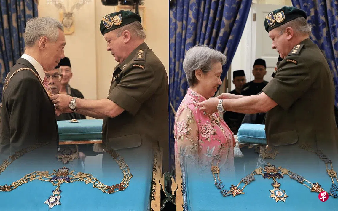 李显龙总理和夫人何晶今天(5月6日)上午在新山大王宫,获马来西亚柔佛苏丹依布拉欣授予拿督勋衔。
