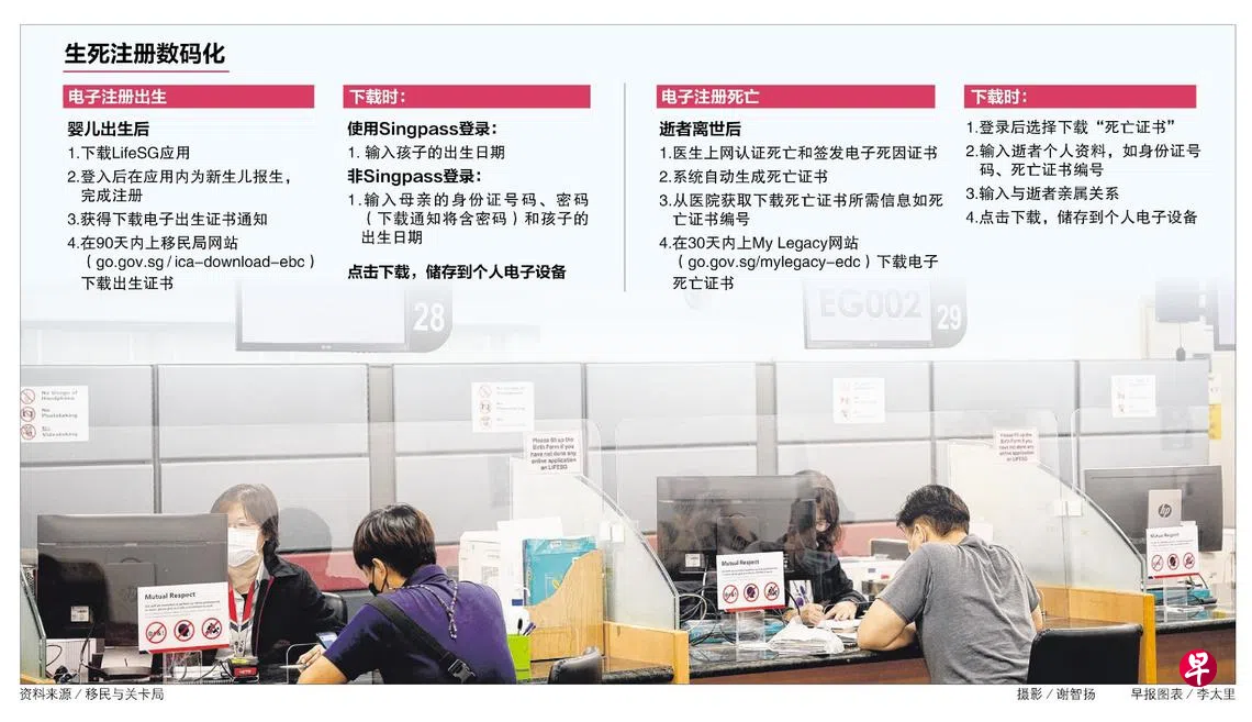 移民与关卡局昨天(5月8日)发文告指出,从29日开始,将注册生死的程序数码化,当局将不再发出纸本的出生证书和死亡证书。过去五年内,移民与关卡局平均每年发出3万9100张出生证书和2万1900张死亡证书。