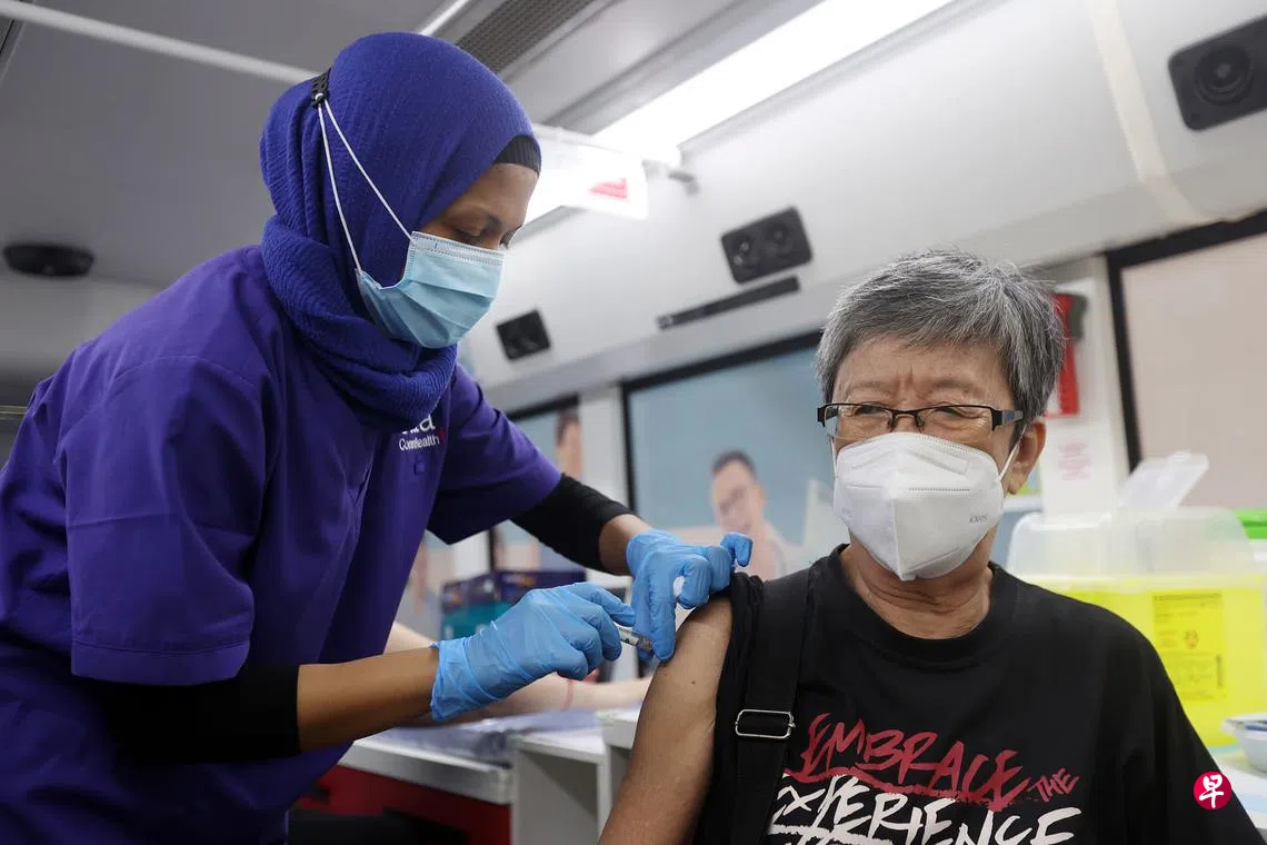 善达社区保健机构(SATA)的医疗电动巴士昨天驶入芽笼峇鲁第59座组屋旁的停车场,为65岁及以上的居民注射流感和肺炎链球菌(pneumococcal)疫苗。