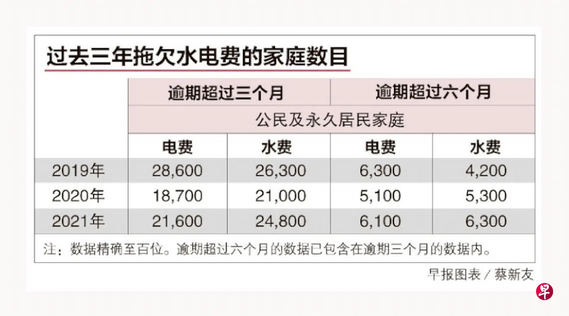 永续发展与环境部长傅海燕通过书面答复说,新加坡有140万个公民及永久居民家庭。截至去年12月31日,拖欠电费和水费超过三个月的家庭分别为2万1600户和2万4800户。其中,超过半年未缴电费和水费的家庭分别为6100户和6300户。