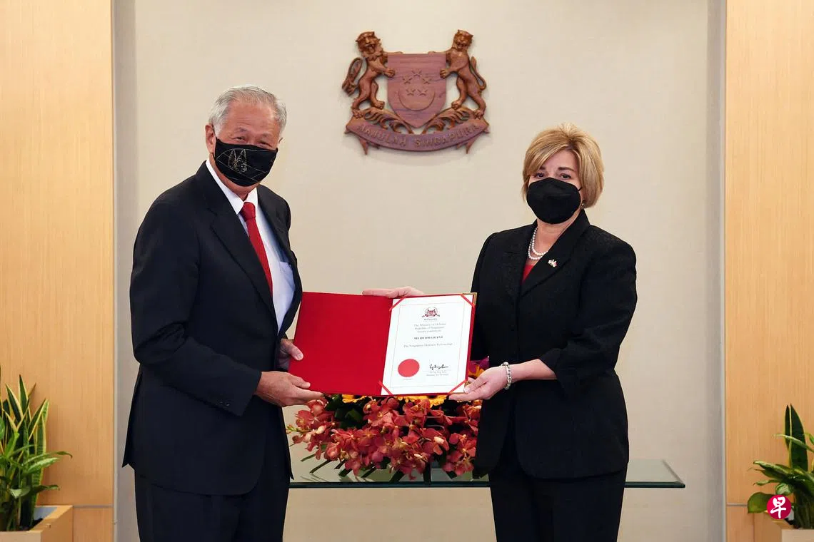 国防部长黄永宏医生(左)将新加坡国防杰出贡献奖(Singapore Defence Fellowship)颁发给美国前空军部次长海蒂·格兰特(Heidi Grant),表彰她在促进新美国防关系和深化两国技术合作的贡献。