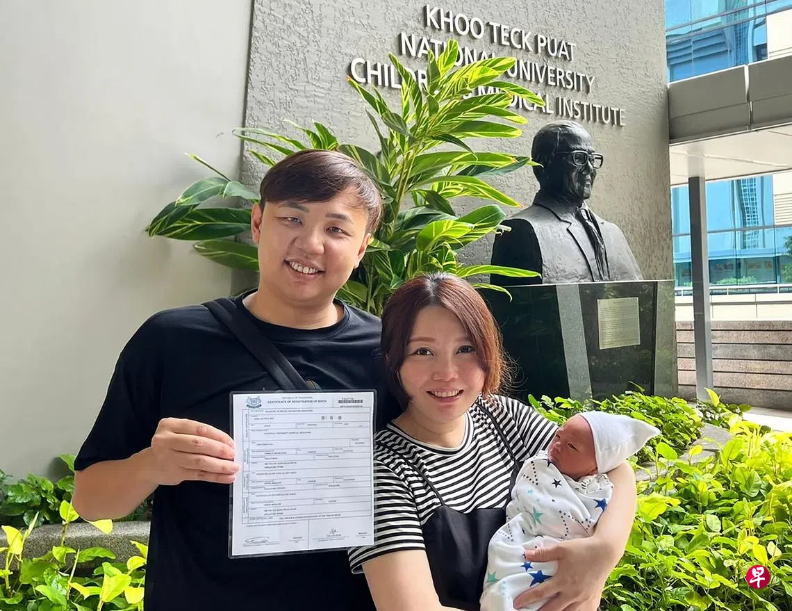 黎扏詠昨早备齐文件前往移民局大厦,赶在电子出生证书落实前,为孩子申请一张纸本证明。他手上拿着的儿子出生证,因此属于最后一批,让他有种见证历史的感觉,他还偕同妻子与儿子回医院拍照留个纪念。(受访者提供)