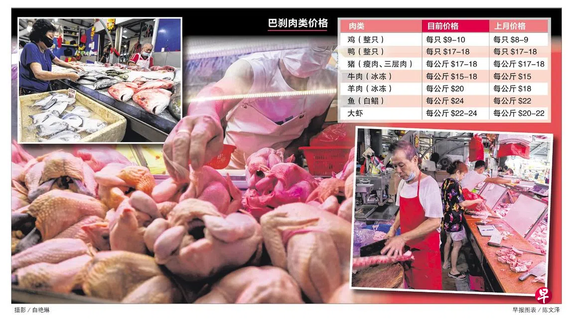 《联合早报》记者昨天走访湿巴刹发现,除了鸡肉价格飙涨,大部分肉类如牛肉、羊肉和鱼虾的售价也比上个月高出一到两成,只有猪肉和鸭肉价格保持平稳。