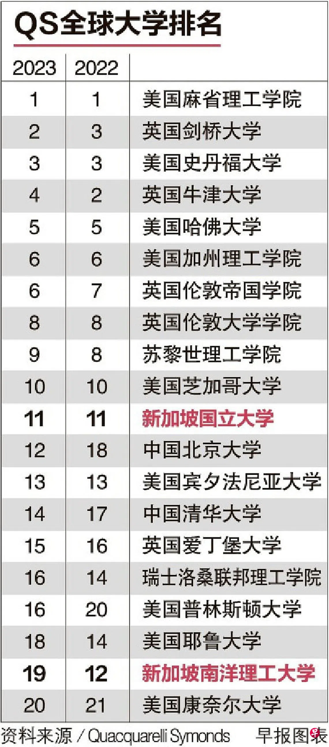 南洋理工大学的国际排名滑落七个名次,排第19名,在亚洲大学排名则从第二跌至第四。