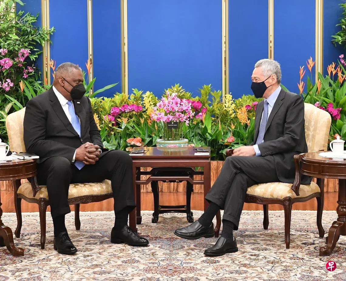 李显龙总理昨天在总统府会见美国国防部长奥斯汀,两人就地缘政治发展和区域安全问题交换意见,并同意美国继续参与本区域事务至关重要。