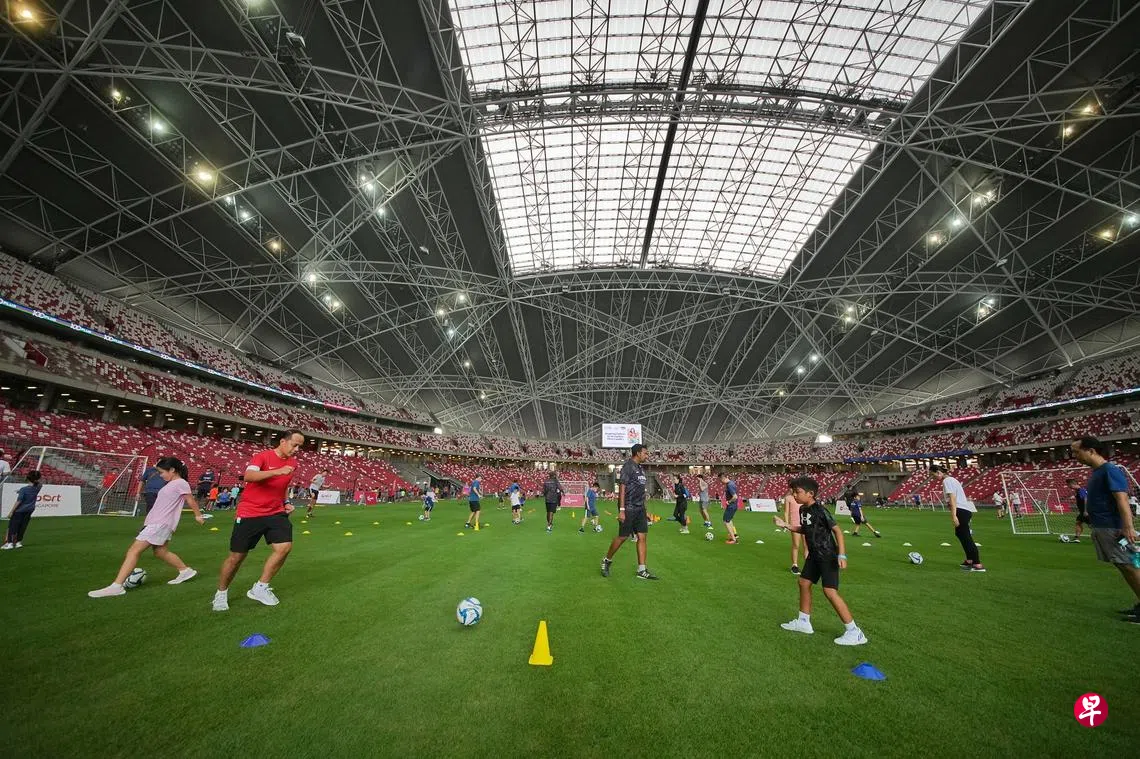 新加坡国家体育场内,父母陪着孩子们在广阔的草坪上踢着足球、在健身教练的带领下做着有氧运动,各个家庭纷纷拍照留念,记下欢乐的亲子时光。位于加冷河畔的新加坡国家体育场昨天(6月11日)迎来近2000名家长与孩童,这也是政府前日宣布将在六个月后接管体育城后,在这里举办的第一场大型民众体育活动。