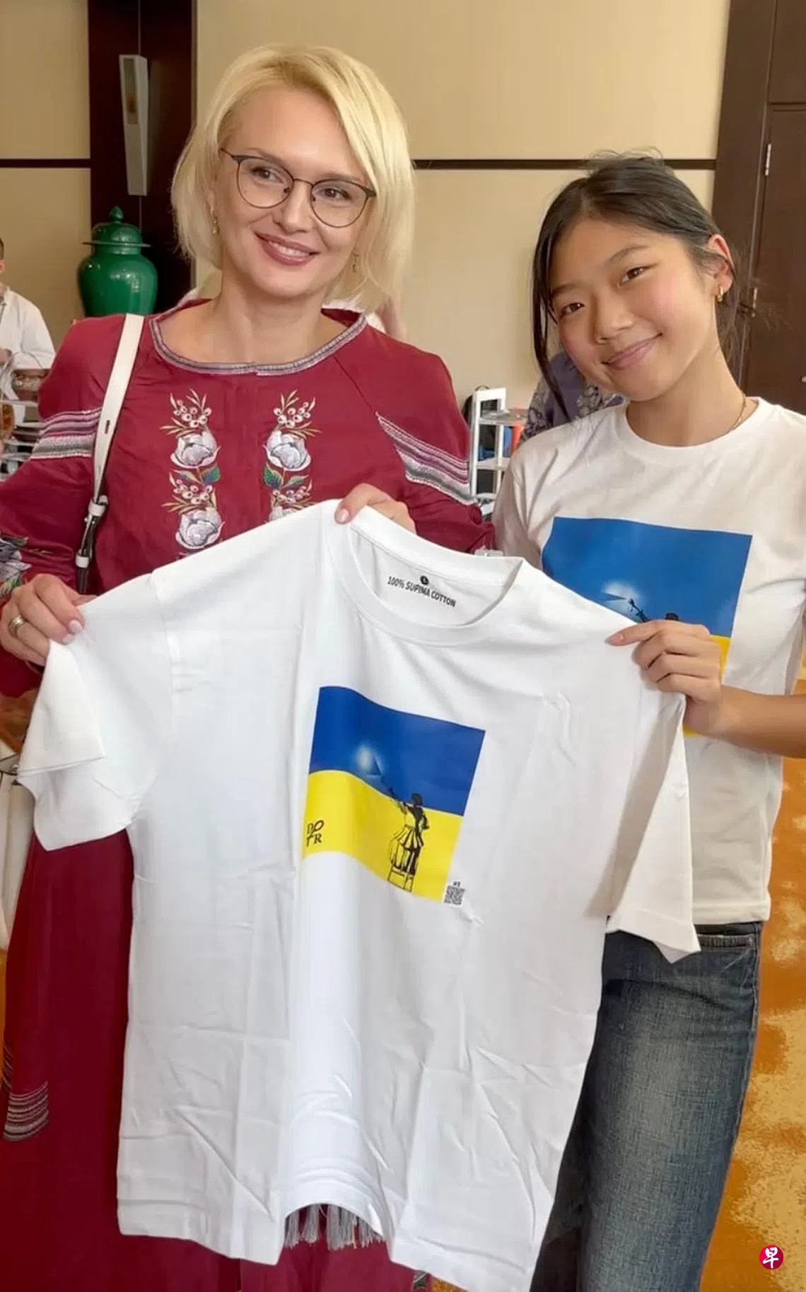 万万没料到乌克兰总统把自己的作品放在心上,16岁新加坡少女苏郁心前天(11日)通过香格里拉对话直播看到泽连斯基身穿自己设计的T恤时,喜极而泣。
