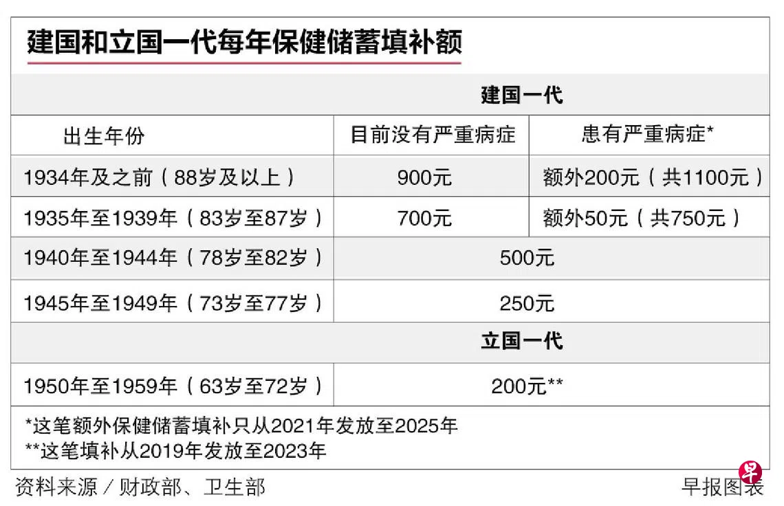 财政部和卫生部昨天(6月13日)发文告说,今年满88岁或以上者可得900元;83岁至87岁得700元;78岁到82岁得500元;73岁至77岁得250元。建国一代可终身享有此填补。