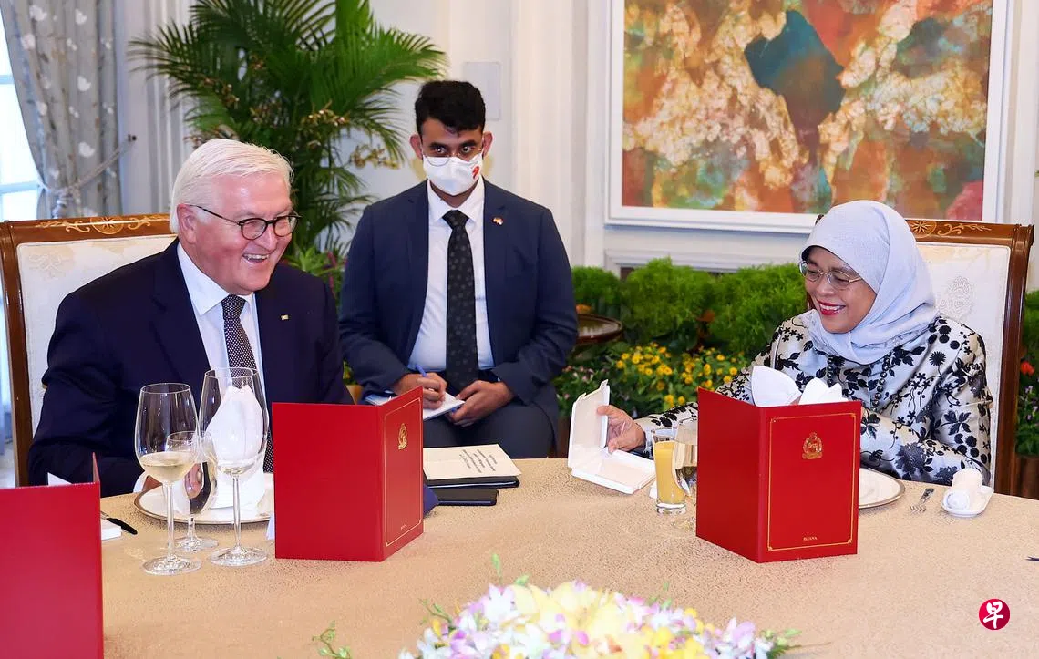 哈莉玛总统昨天在总统府设午宴,款待对我国展开工作访问的德国总统施泰因迈尔。她在面簿贴文说,两人会面时就冠病疫情期间,以及眼下前所未有的冲突和挑战中多边主义的重要性进行了讨论。