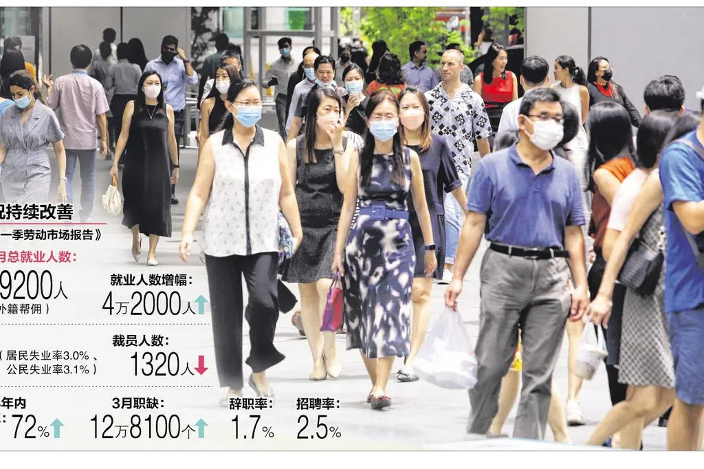 总辞职率和招聘率在上几个季度呈上升趋势后,今年第一季趋稳,分别是1.7%和2.5%。不过,白领雇员特别是专业人士、经理、执行人员和技师(PMET)的辞职和招聘率攀升,高于疫前水平,分别是1.4%和1.9%,这仍比高峰期的2.3%和3.2%来得低。