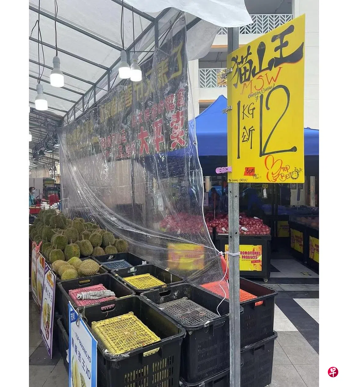 马国天气变热,榴梿意外大丰收,本地多家榴梿摊大降价,猫山王每公斤只卖12元。