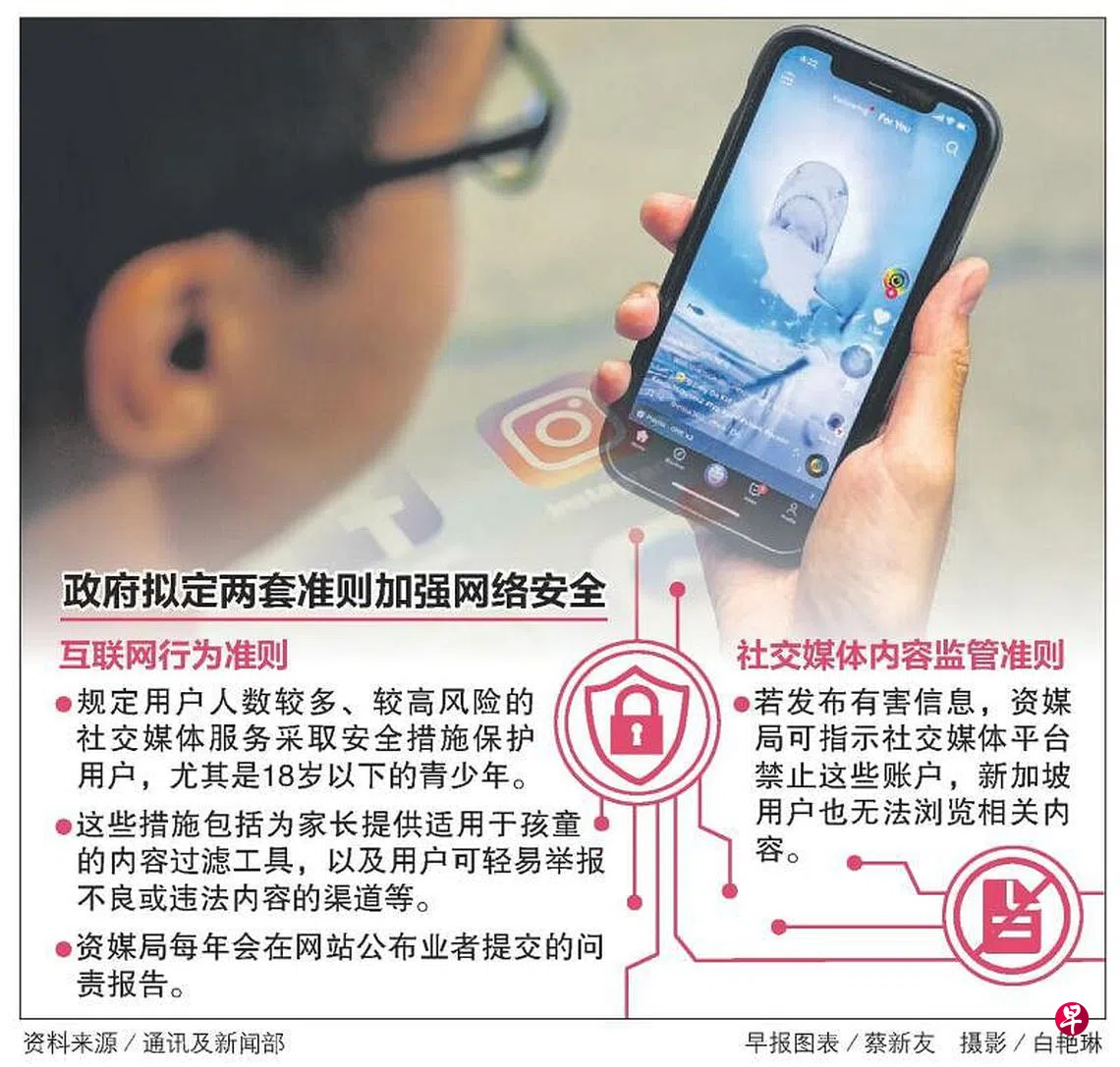 网络空间藏有不少安全隐患,政府将通过拟议中的互联网行为准则以及社交媒体内容监管准则,加强对用户的保护。前者规定面簿、Instagram和TikTok等用户人数较多、风险较高的社媒服务须采取安全措施。后者则赋予资讯通信媒体发展局更多权限,在发现有害内容时能指示业者禁止新加坡用户浏览,或与发表这些内容的账户交流。