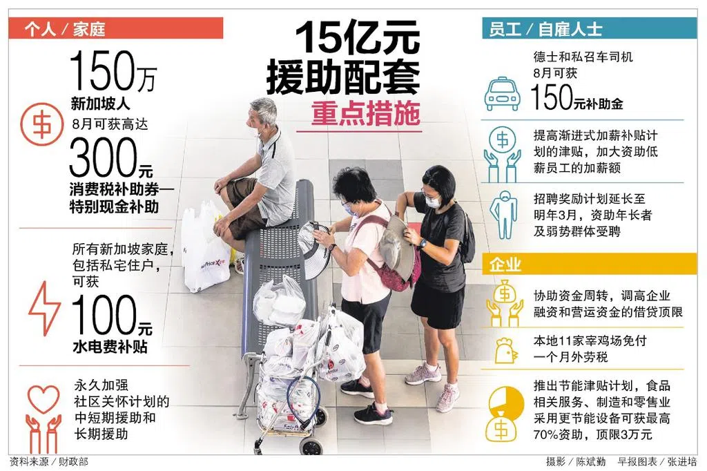 政府推出额外援助措施,减轻中、低收入和弱势群体在高通胀期的生活负担,约150万名新加坡人8月可额外获得最高300元的消费税补助券——特别现金补助。