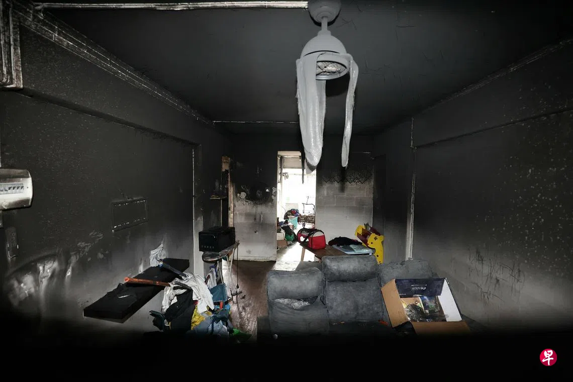 记者隔天早上走访失火单位时,走廊还弥漫着浓浓的烧焦味,单位外的墙壁已经熏黑。透过窗户可见客厅天花板上的电风扇扇叶已熔化变形,屋内的物品也被烧毁。