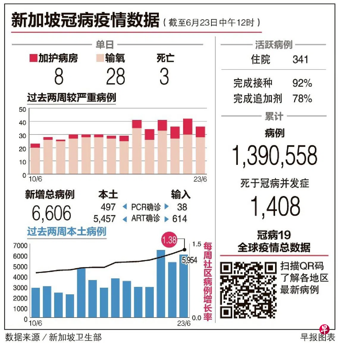 本地昨天新增6606起冠病病例,比前天多出744起,每周病例传播率进一步攀升至1.38。昨天也通报三起死亡病例。