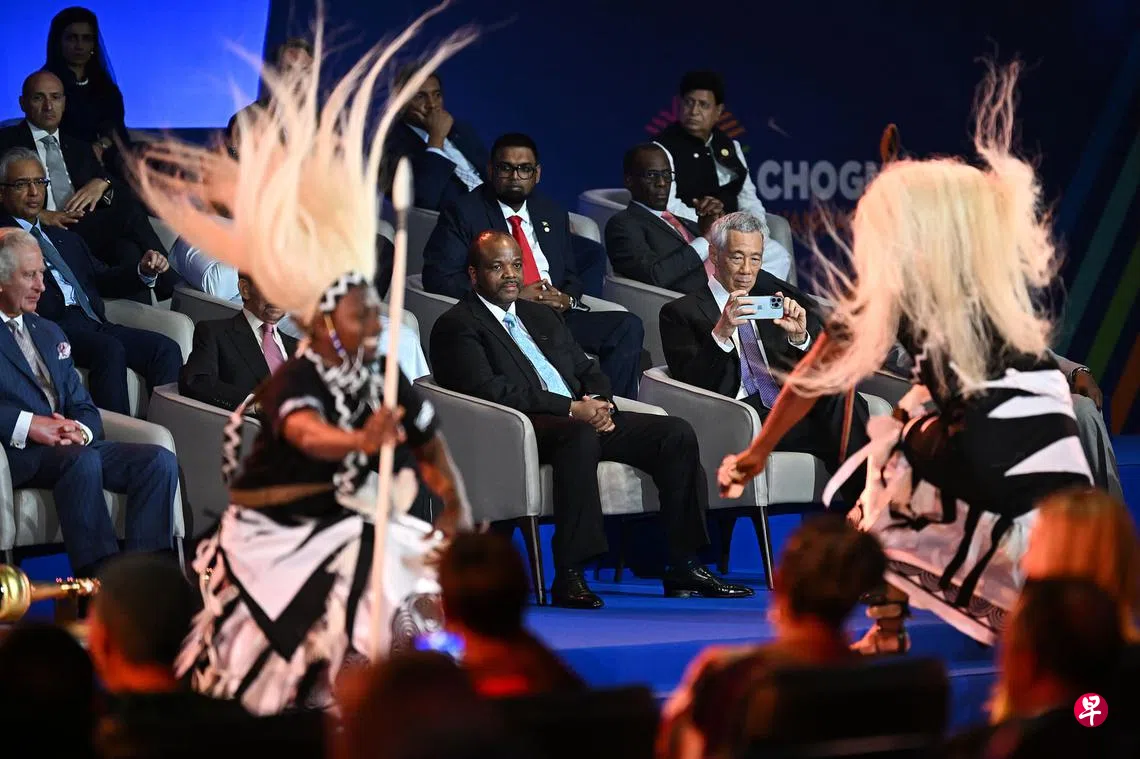 出访卢旺达的李显龙总理(右一)出席了在基加利会展中心举办的招待会,和其他国家领袖一同观赏舞者呈献的传统歌舞表演。