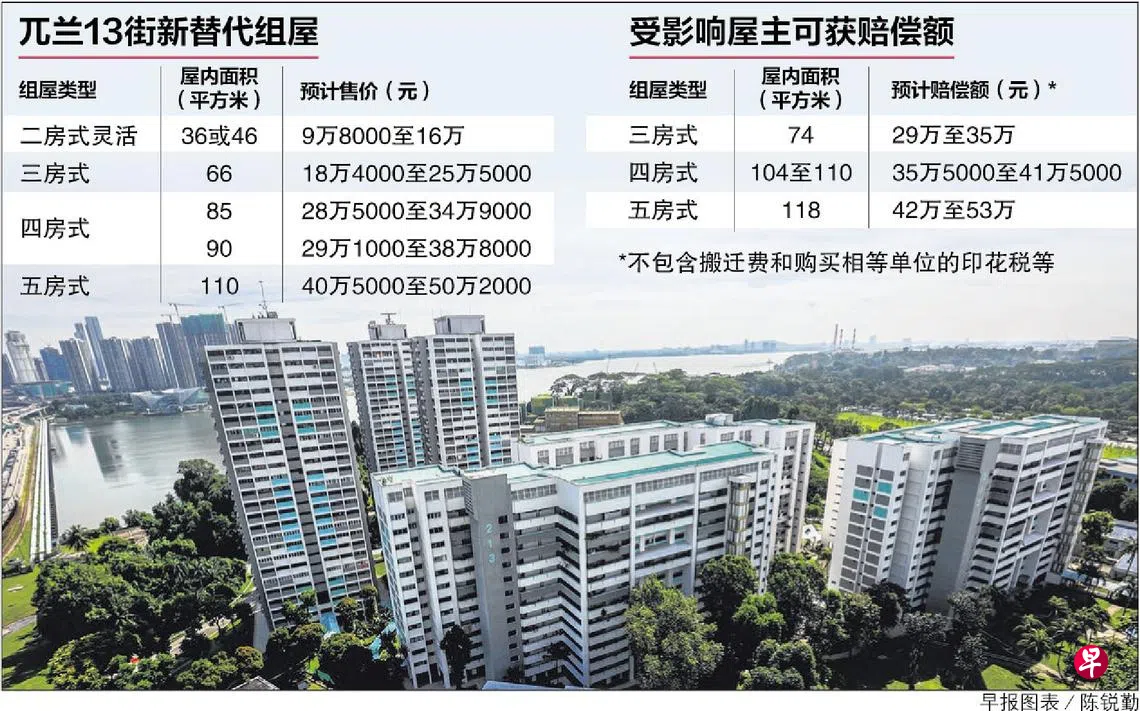 根据政府日前发给居民的通知,面积约74平方米三房式单位的赔偿额预计介于29万至35万元;面积约104至110平方米四房式单位的赔偿额预计介于35万5000元至41万5000元;面积约118平方米五房式单位的赔偿额,则预计介于42万元至53万元。