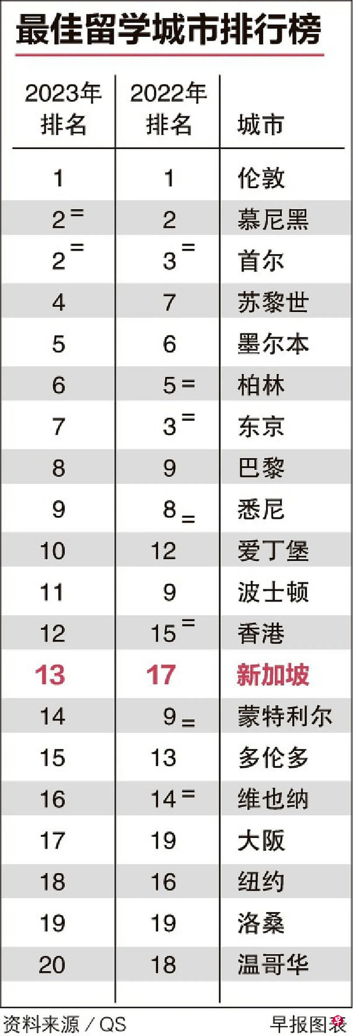 在最新公布的“最佳留学城市排行榜”中,伦敦连续四年登上榜首。新加坡在城市吸引力和大学毕业生受雇主欢迎程度指数上表现出色,晋级四个名次,在140个城市中排第13名。