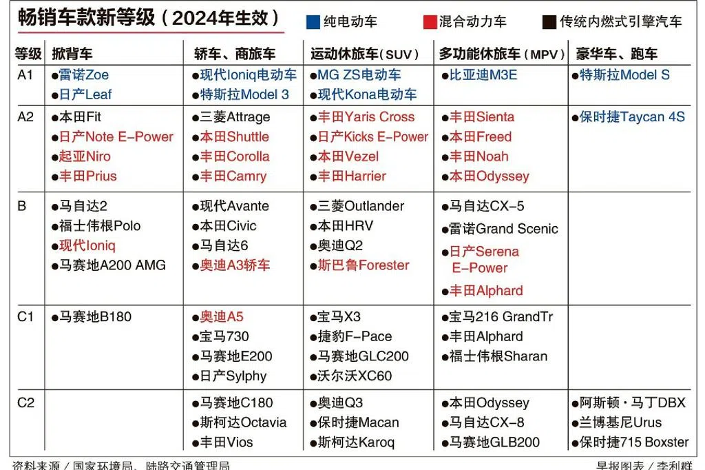 A2级别车款则包括高功耗的电动车、多数的混合动力车,以及效率高的小型内燃式引擎车,例如本田Fit、丰田Prius掀背车、起亚Niro混合动力车和保时捷Taycan 4S电动车。