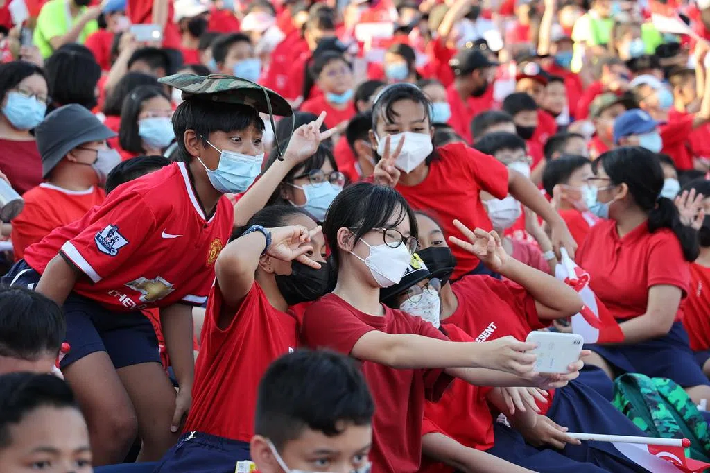 手中挥动着小国旗,每当战斗机冲过天际时,他们都会兴高采烈地欢呼。巨型国旗从空中飞过与国歌前奏响起时,这些小五学生都大声地唱国歌和念出信约,以国为傲的情绪表露无疑。