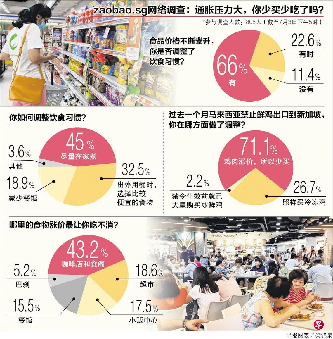 约800人参与zaobao.sg网络调查,超过六成表示食品价格不断攀升,已调整饮食习惯。有四成像林娇那样会尽量自己在家煮、三成受访者出外用餐时,会选择比较便宜的食物。